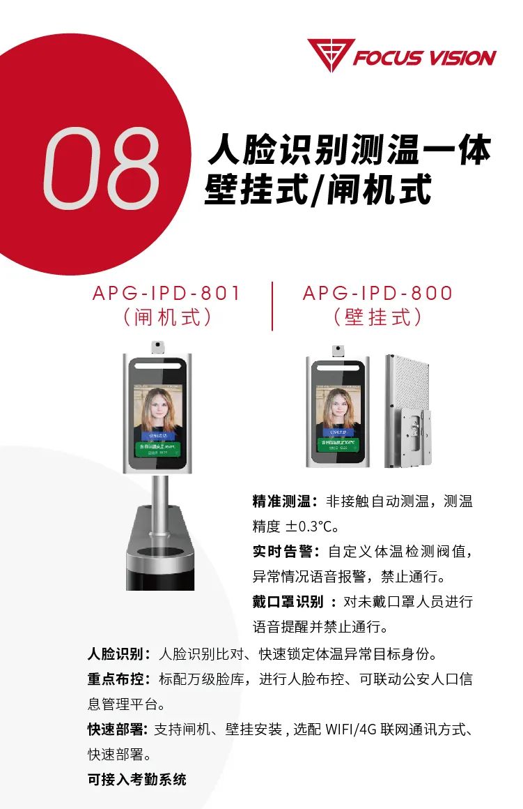 性价比高,精准高效测温的同时,可接入考勤系统,通过人脸识别,对学生迟到、缺勤等情况进行监督,并可配合闸机实现体温检测和人员进出联动,闸机可为体温正常人员自动开闸。